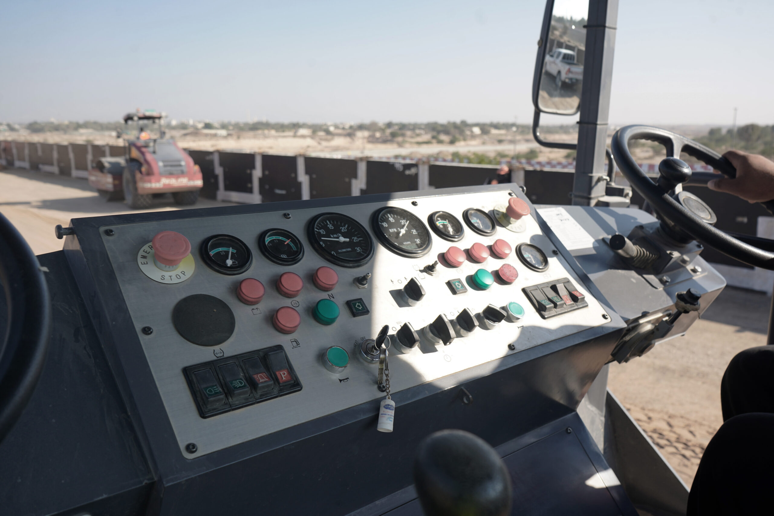 The seat, steering wheel, and controls
